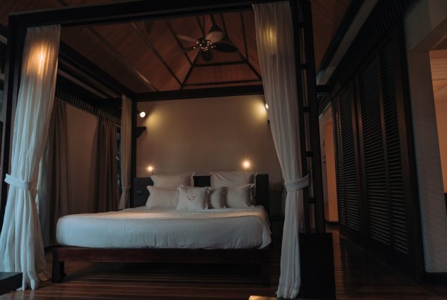 Enveloppés d'un délicat tissu blanc, le lit king size à baldaquin, la lampe suspendue au plafond voûté en bois, le mobilier sur mesure, les larges fenêtres et portes terrasses, créent une atmosphère très chic et intimiste.