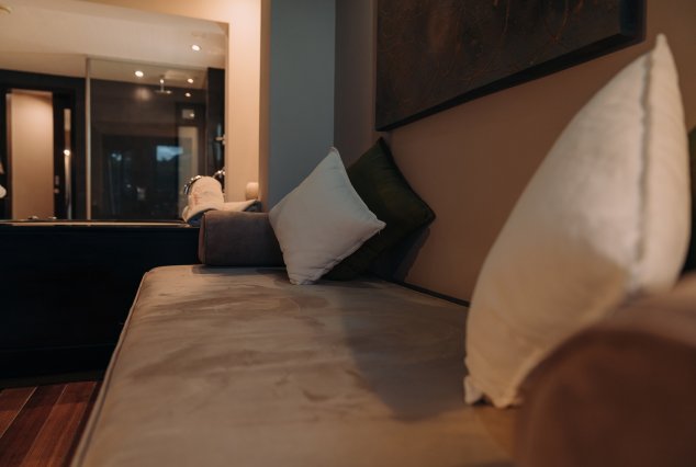 La suite spacieuse de 87 m² dispose également d'un espace salon avec un canapé confortable de couleur beige, habillé de coussins blancs et verts pour se reposer ou s'adonner à la vue fondante du lagon bleu turquoise.