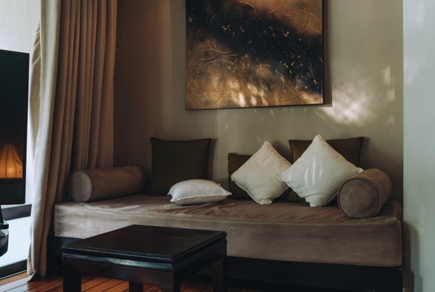 Le duplex s'ouvre sur un grand séjour avec mini bar, télévision et lecteur DVD, ainsi que des sanitaires.