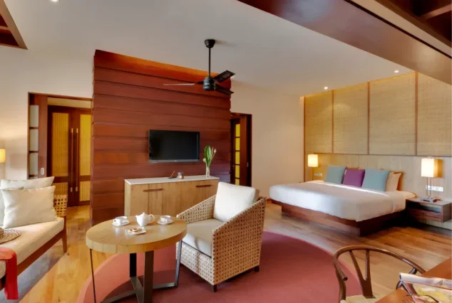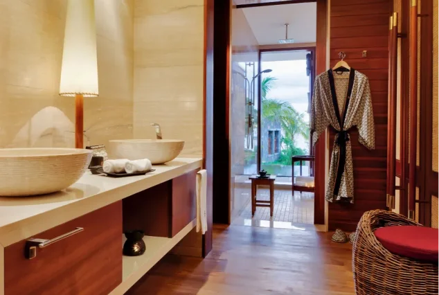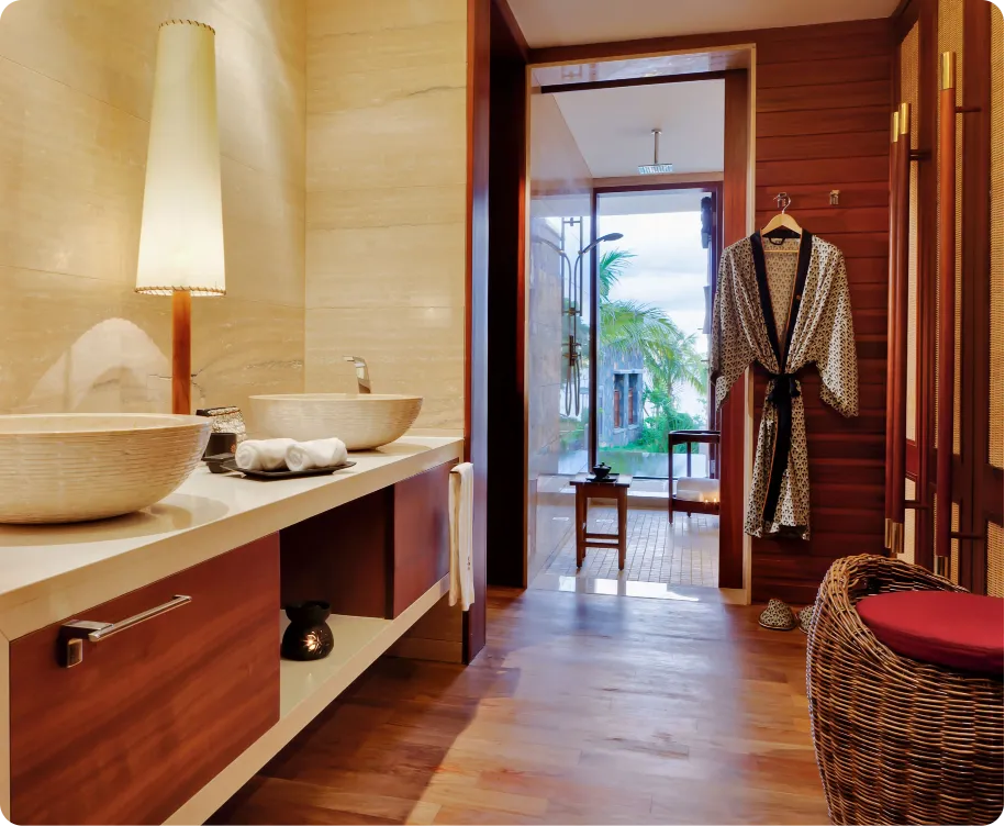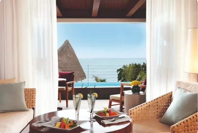 Avec un balcon privé doté d'une piscine à débordement chauffée – option de piscine chauffée disponible – donnant sur les jardins luxuriants de notre complexe mauricien, les magnifiques piscines et le magnifique océan, vous n'aurez que l'embarras du choix de vues dans ce généreux 84 m² (904 pieds carrés) suite au dernier étage. Débordant de romantisme avec ses parquets en bois richement travaillés, ses murs en rotin tressé, son bel extérieur en pierre naturelle, son mobilier élégant aux couleurs douces et sa salle de bains luxueuse composée des meilleurs matériaux nobles, cette demeure avec vue sur la mer promet une escapade des plus idylliques.
