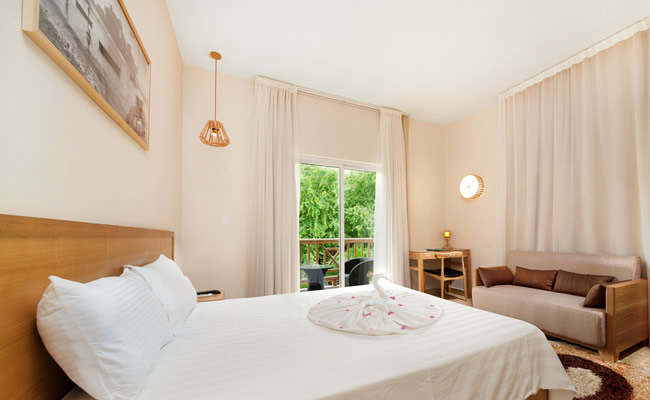 Nos 41 Chambres Standard, d'une superficie de 43 m², sont équipées d'un lit Queen Size ou de deux lits simples, d'une salle d'eau et d'un espace extérieur avec vue sur le jardin ou la piscine.